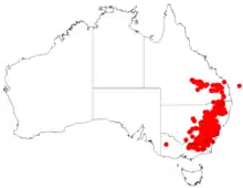 The species occurs in dry sclerophyll forest, woodland or heath in Victoria, New South Wales and Queensland.[2] It is typically found on hills, slopes and plains inland from the coast and grows in sandy, clay or loam soils.[3]