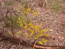 The medium sized evergreen shrub grows to a height of 1 to 4 m (3 ft 3 in to 13 ft 1 in) and a width of 2 to 3 m (6 ft 7 in to 9 ft 10 in) .[3] The plant has an erect habit with glabrous, flattened and angled branchlets. It has phyllodes that are 10 to 45 mm (0.39 to 1.77 in) in length and 2 to 11 mm (0.079 to 0.433 in) wide. The bright yellow spherical flowerheads appear in groups of 2 to 14 in the axils of the phyllodes from July to November in the species' native range, followed by straight or curved seed pods which are 30 to 70 mm (1.2 to 2.8 in) long and 5 to 8 mm (0.20 to 0.31 in).[2]
