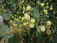 The tree grows to between 10 to 15 m (33 to 49 ft) in height and has a pyramidal habit with glabrous branchlets that have a fine white powdery coating. Like most species of Acacia it has phyllodes rather than true leaves. The evergreen phyllodes have an obovate to oblanceolate or sometimes narrowly elliptic shape with a length of 4 to 8 cm (1.6 to 3.1 in) and a width of 1.5 to 3 mm (0.059 to 0.118 in). The lemon yellow globular flowerheads appear in racemes from November to December in the species' native range, followed by seed pods that are 5 to 12 cm long and 1.4 to 2.2 cm wide.[3]