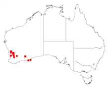 It has a scattered distribution in the Wheatbelt of Western Australia where it grows in sandy, clay gravelly soils often around laterite.[1] Found in areas around Watheroo and Manmanning as a part of sandy heathland communities.[2]