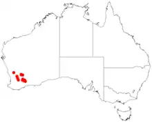 It is native to a small area of the Wheatbelt region of Western Australia[1] where it has a scattered distribution from around the Chiddarcooping Nature Reserve in the north down to around Hyden the south over a distance of about 200 km (120 mi) where it is often situated among and around granite outcrops growing in gravelly loam soils as a part of Melaleuca shrubland or low heath communities and is also associated with Eucalyptus stowardii and species of Casuarina.[2]