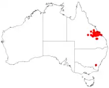 It is endemic to Queensland and is distributed down along the Great Dividing Range from around Moranbah in the north to around Mara in the south and is especially common on the Blackdown Tableland. It is situated in a variety of habitat that is over or around sandstone where it grows in sandy, gravelly or loamy soils as a part of open Eucalyptus woodland communities.[1]