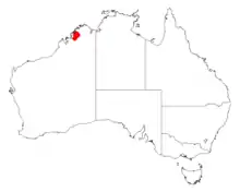 It is endemic to the north western parts of Western Australia in the Kimberley region where it is found in the Prince Regent River catchment area with reasonably large populations with the individuals growing in skeletal sandy soils over broken sandstone scattered over several kilometres. It is part of scrubland communities that also include Acacia orthocarpa, Eucalyptus miniata, Eucalyptus phoenicea, Owenia vernicosa and Triodia claytonii.[1]