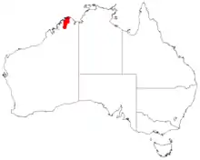 It is native to an area in the Kimberley region of Western Australia where it is found on ridges amongst rocks in areas of sandstone and quartzite.[1] The bulk of the population is found in the King Edward River district around the Kalumburu Mission where it is usually part of mixed woodland communities on ridges or on river banks in deep sand.[2]