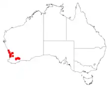 It is native to an area in the Wheatbelt and Peel regions of Western Australia where it is commonly situated in low lying areas growing in gravelly or sandy soils.[1] The range of the plant extends from around Eneabba in the north down to around Mundijong in the south and out to around also Wongan Hills and Newdegate in the east.[2]