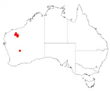 It is native to an area in the Pilbara region of Western Australia where it is often situated on scree slopes of low ranges growing in stony red loamy soils.[1] It has a limited range mostly within the Hamersley Range National Park where it is considered to be abundant on the lower slopes where the watercourses exit the range.[2]