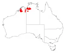 It is native to an area in the Northern Territory and the Kimberley region of Western Australia where it is commonly situated on hillsides and among rocky outcrops growing in gravelly skeletal soils in and around areas of quartzite and sandstone.[1] The range of the shrub extends over the rugged hills of the Isdell Range, Artesian Range and Phillips Ranges in Western Australia and the Fitzroy Range of the Northern Territory as a part of shrubland and open woodland communities.[2]