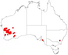 It is native to an area in the Mid West, Wheatbelt and Goldfields regions of Western Australia where it is often found among granite outcrops[3] growing is sandy loamy soils.[1] The population is scattered from Mullewa and Jingemarra Station in the north down to around Peak Charles National Park in the south east where it is mostly found in shrubland communities.[4]