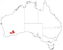 It is native to an area in the southern Goldfields region of Western Australia where it is found on plains and low rocky ridges growing in granitic loamy sands or clay sand soils.[1] The species has a scattered distribution between Kambalda in the north down to around Norseman in the south where it is usually found as a part of low open shrubland communities.[2]
