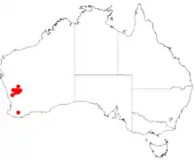 It is native to an area in the Wheatbelt and Goldfields-Esperance regions of Western Australia between Yalgoo in the north to Moora in the south growing in clay or loamy-sandy soils.[1]