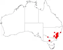It is endemic to New South Wales from around the Budawang Range in the north down to near Mount Coricudgy where it is found scattered on tablelands growing in sandy soils as a part of dry sclerophyll forest communities.[1] It is common in the western Blue Mountains from around Braidwood to Tumut.[2]