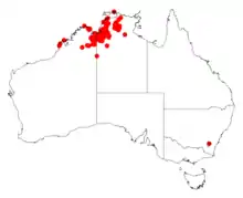It is native to a large area in the Northern Territory and the Kimberley region of Western Australia where the plant will grow in sandy or loamy soils and prefers damp conditions.[1] It is often situated along creek banks growing in sandy soils as a part of Eucalyptus woodland communities where it is often found in shady locations on or around sandstone or laterite.[2]