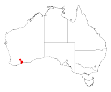 It is native to an area along the south coast in the Goldfields-Esperance region of Western Australia from around Esperance in the west to around Israelite Bay in the east where it is found around the margins of salt lakes and on sandplains growing in sandy-clay soils often around limestone.[1] The bulk of the population is found in the Ravensthorpe Range situated on the lower slopes often around watercourses as a part of dense mallee shrub and woodland communities.[2]