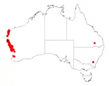It is native to an area in the Mid West, Wheatbelt and Gascoyne regions of Western Australia where it is commonly situated on sandplains and around ares of coastal limestone growing in sandy soils.[2] The range of the plant extends from around Cape Range National Park in the north south along the coast through Kalbarri and Jurien where it is far more common. It is found as far as Mullewa and Piawaning in the east and is usually a part of coastal heath, low woodland and shrubland communities.[3]