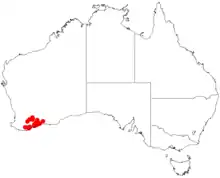 It is native to an area in the Great Southern, Goldfields-Esperance and Wheatbelt regions of Western Australia where it is commonly situated on plains along creeks and rivers growing in rock or sandy loams or sandy-clay or sandy soils often over or around granite.[1] The range extends from just south of the Stirling Range in the north-west out to around Ravensthorpe in the south east with outliers near Nyabing and Lake King both of which are further north.[2]