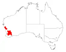 It is native to an area in the Wheatbelt region of Western Australia where it is often situated on rocky ridges, flats and salt flats where it grows in sandy or sandy loam soils often with lateritic gravel.[1] The bulk of the population is found from around Wongan Hills and Mukinbudin in the north down to around Pingelly and Hyden in the south with disjunct populations around Geraldton.[2]