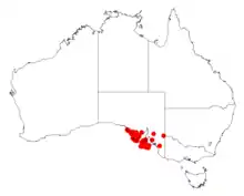 It is endemic only in a small area in South Australia on the Eyre Peninsula from around Calca in the north to Port Lincoln in the south and is also found on the Yorke Peninsula from Port Rickaby in the north to Kangaroo Island in the south where it is found on sea cliffs or in damp areas where it grows in sandy soils over and around limestone as a part of scrub and mallee communities.[2]