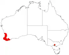 It is native to an area in from the south of New Norcia in the Wheatbelt, extending south through the Peel and South West to around Augusta and then east to around Walpole in the Great Southern region of Western Australia where it is found in along watercourses and other damp locations growing in lateritic soils.[4] In southwestern areas it is commonly part of the understorey in the Eucalyptus diversicolor forests and can form dense stands after bushfires following fire. In the north it is found less frequently and occurs as disjunct populations along creeks in Eucalyptus marginata forest and woodland communities.[1]