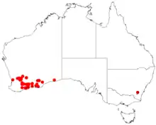 It has a scattered distribution along the south coast and island areas of Western Australia in the southern Wheatbelt, Great Southern and southern Goldfields-Esperance regions. The range of the species is from around Trayning and Chiddarcooping Hill in the north to the Fitzgerald River National Park in the south and as far east as Buningonia Spring and Sparkle Hill in the east with outlying specimens have been found as far east as Madura where it is found growing in loamy or sandy or clay soils that can be quite gravelly.[1]