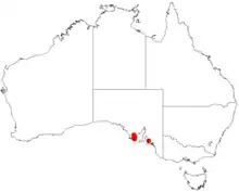 It is found on limestone and loam, sometimes near salt swamps, but only in the near-coastal areas south of Tumby Bay on the Eyre Peninsula, South Australia.[5]