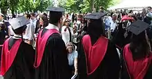 The gowns all have a crow's-feet emblem on the front, which is a "double crow's-feet" for earned degrees, and a "triple crow's-feet" for honorary degrees (a tradition which, having been abandoned beginning in the 1980s, was restored in 2017).[4] This is derived from the use of similar emblems to denote class standing on undergraduate gowns in the early nineteenth century.[5] The Harvard regalia deviates from the Intercollegiate Code's standards in that the color of the degree is shown on the crow's-feet emblem instead of on the hood trimming, and the color refers to the school granting the degree rather than the subject of the degree itself. The colors are:[1]