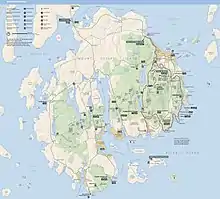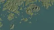 Acadia National Park encompasses a total of 49,075 acres (76.7 sq mi; 198.6 km2) as of December 31, 2017.[1] At least 30,200 acres (47.2 sq mi; 122.2 km2) on Mount Desert Island are included in the park, along with 2,900 acres (4.5 sq mi; 11.7 km2) on Isle au Haut, about 200 acres (0.3 sq mi; 0.8 km2) on smaller islands, and 2,366 acres (3.7 sq mi; 9.6 km2) on the Schoodic Peninsula.[note 1][9][10] As of 2015, the permanent park boundary, as established by act of Congress in 1986, included 12,416 acres (19.4 sq mi; 50.2 km2) of privately owned land under conservation easements managed by the National Park Service, which plans to acquire the land at some point.[2]