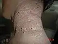 On biopsy, hyperkeratosis, epidermal folding, leukocyte infiltration, and melanocyte proliferation may be seen.[3]:979[4]:87