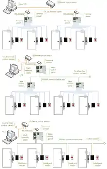 3. Serial main controllers & intelligent readers. All door hardware is connected directly to intelligent or semi-intelligent readers. Readers usually do not make access decisions, and forward all requests to the main controller. Only if the connection to the main controller is unavailable, will the readers use their internal database to make access decisions and record events. Semi-intelligent reader that have no database and cannot function without the main controller should be used only in areas that do not require high security. Main controllers usually support from 16 to 64 readers. All advantages and disadvantages are the same as the ones listed in the second paragraph.