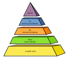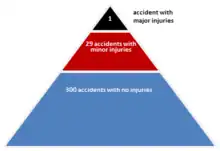 The triangle shows a relationship between the number of accidents resulting in serious injury, minor injuries or no injuries. The relationship was first proposed in 1931 by Herbert William Heinrich in his Industrial Accident Prevention: A Scientific Approach.[1] Heinrich was a pioneer in the field of workplace health and safety. He worked as an assistant superintendent for an insurance company and wanted to reduce the number of serious industrial accidents. He commenced a study of more than 75,000 accident reports from the insurance company's files as well as records held by individual industry sites.[2] From this data he proposed a relationship of one major injury accident to 29 minor injury accidents, to 300 no-injury accidents. He drew the conclusion that, by reducing the number of minor accidents, industrial companies would see a correlating fall in the number of major accidents.[2][1] The relationship is often shown pictorially in the form of a triangle or pyramid. The triangle was widely used in industrial health and safety programmes over the following 80 years and was described as a cornerstone of health and safety philosophy.[2][1] Heinrich's theory also suggested that 88% of all accidents were caused by a human decision to carry out an unsafe act.[2]
