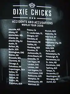 The North American leg of the tour was announced on May 18, 2006, for approximately 60 shows to run from late July through early November.[1] While the Chicks' 2003 Top of the World Tour also took place after the Bush controversy, most of the tickets had already been sold beforehand, and it was the top-grossing country tour of that year. Despite good sales figures for the new Taking the Long Way album, however, initial ticket sales for the Accidents & Accusations Tour were far below expectations. Four dates in Memphis, Oklahoma City, Fresno, and Indianapolis were dropped from the tour schedule. In Houston, tickets never went on sale, with the concert promoter noting that local radio stations "wouldn't even accept our advertising money."[2] Arenas holding 15,000 capacity were only selling 5,000–6,000 seats, sometimes less.[3]