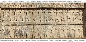Indian soldiers of the three territories of Gandara, Sattagydia (Tathagatus) and Hindush are shown, together with soldiers of all the other nations, supporting the throne of their Achaemenid ruler, at Naqsh-e Rostam on the tombs of Darius I, Xerxes I, Artaxerxes I and Darius II, and at Persepolis on the tombs of Artaxerxes II and Artaxerxes III. The last Achaemenid ruler Darius III never had time to finish his own tomb due to his hasty defeat by Alexander the Great, and therefore does not have such depictions.[49][72] The soldiers from India are characterized by their particular clothing, only composed of a loin cloth and sandals, with bare upper body, in contrast to all the other ethnicities of the Achaemenid army, who are fully clothed, and in contrast also to the neighbouring provinces of Bactria or Arachosia, who are also fully clothed.[49]