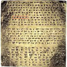Four identical foundation tablets of gold and silver, found in two deposition boxes in the foundations of the Apadana Palace, also contained an inscription by Darius I in Old Persian cuneiform, which describes the extent of his Empire in broad geographical terms, from the Indus valley in the east to Lydia in the west, and from the Scythians beyond Sogdia in the north, to the African Kingdom of Kush in the south. This is known as the DPh inscription.[35][36] The deposition of these foundation tablets and the Apadana coin hoard found under them, is dated to circa 515 BCE.[35]