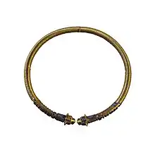 Two types of objects were found. There several items placed next to the deceased. These include two alabaster vessels and a silver bowl. All other items were found on the skeleton. There are several necklaces made of different materials. A torc was found around the neck and has end pieces with lion heads. The torc is made of gold with inlays in other materials.[2] Two similar armlets were found. They are also made of gold and decorated with inlays.[3]
