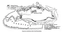 There is little doubt that a Mycenaean megaron palace stood upon the hill during the late Bronze Age. Nothing of this megaron survives except, probably, a single limestone column-base and pieces of several sandstone steps.[5] Soon after the palace was constructed, a Cyclopean massive circuit wall was built, 760 meters long, up to 10 meters high, and ranging from 3.5 to 6 meters thick. This wall would serve as the main defense for the acropolis until the 5th century.[6] The wall consisted of two parapets built with large stone blocks and cemented with an earth mortar called emplekton (Greek: ἔμπλεκτον).[7] The wall uses typical Mycenaean conventions in that it followed the natural contour of the terrain and its gate, which was towards the south, was arranged obliquely, with a parapet and tower overhanging the incomers' right-hand side, thus facilitating defense. There were two lesser approaches up the hill on its north side, consisting of steep, narrow flights of steps cut in the rock. Homer is assumed to refer to this fortification when he mentions the "strong-built House of Erechtheus" (Odyssey 7.81). At some time before the 13th century BC, an earthquake caused a fissure near the northeastern edge of the Acropolis. This fissure extended some 35 meters to a bed of soft marl in which a well was dug.[8] An elaborate set of stairs was built and the well served as an invaluable, protected source of drinking water during times of siege for some portion of the Mycenaean period.[9]