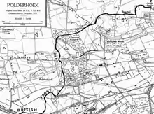 The New Zealand Division occupied about a 1.5 mi (2.4 km) front on the right flank of the corps. There was salient to the north at the In de Ster Cabaret between Noordemhoek and Reutel and beyond Reutel, the line curved to the south-west to the Polygonebeek, which flowed from Polygon Wood.[15] The Polygonebeek joined the Reutelbeek on flat ground about 500 yd (460 m) in front of the New Zealand positions. South of the Polygonebeek the line continued south-west along the edge of Cameron Covert, which was held by posts rather than a continuous line and then descended towards the Reutelbeek, connecting with IX Corps close to the Menin road.[16]