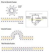 Neurotransmitter release can be measured by determining the amplitude of the postsynaptic potential after triggering an action potential in the presynaptic neuron. Measuring neurotransmitter release this way can be problematic because the effect of the postsynaptic neuron to the same amount of released neurotransmitter can change over time. Another way is to measure vesicle fusion with the presynaptic membrane directly using a patch pipette. A cell membrane can be thought of as a capacitor in that positive and negative ions are stored on both sides of the membrane. The larger the area of membrane the more ions that are necessary to hold the membrane at a certain potential. In electrophysiology this means that a current injection into the terminal will take less time to charge a membrane to a given potential before vesicle fusion than it will after vesicle fusion. The time course to charge the membrane to a potential and the resistance of the membrane is measured and with these values the capacitance of the membrane can be calculated by the equation Tau/Resistance=Capacitance. With this technique researchers can measure synaptic vesicle release directly by measuring increases in the membrane capacitance of the presynaptic terminal.[20]
