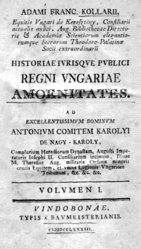 - The unadjusted spelling of the title: Historiae ivrisqve pvblici Regni Vngariae amoenitates. ("Amenities of the History and Constitutional Law of the Kingdom of Hungary.")