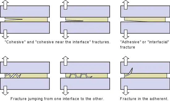 Adhesive fracture (sometimes referred to as interfacial fracture) is when debonding occurs between the adhesive and the adherend. In most cases, the occurrence of adhesive fracture for a given adhesive goes along with smaller fracture toughness.