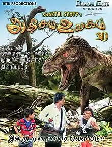 Adhisaya Ulagam (World of Wonders) is a 2012 Indian Tamil science fantasy film written and directed by Shakti Scott and produced by R. Banuchitra. The film stars J. Livingston, Sree Lakshmi, Mannan Prithivraj, Anandha Kannan, and Latha Rao, in a project combining animation with live action as India's first 3D film that featured dinosaurs.[1][2] In the film, Neelakantan, an Indian scientist, invents a time machine through which he and his grandchildren are accidentally transported to the prehistoric world. There they encounter numerous now extinct animals, including dinosaurs. The film was released on 10 August 2012 in India. In the director's words the film received mostly negative reviews majorly because the critics failed to recognize the fact it was made in a zero budget. According to The Times of India, the director of the film failed as a storyteller and the film was "a bland Jurassic adventure".[3]