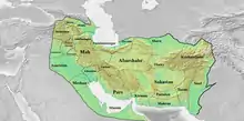 A similar list is mentioned in the Ka'ba-ye Zartosht of the 3rd-century Zoroastrian priest Kartir. The provinces of the late Sasanian realm are listed in the Bundahishn and Vendidad.[1] Provinces were split into smaller administrative divisions, particularly the khwarrah (same origin as the Iranian/Zoroastrian concept khwarrah, "glory/fortune"), rostag or tasug (districts), and dehs (villages). These divisions were not always used all over the realm, and records of other units are known, such as an awestam, which was ostensibly akin to a shahr and was administered by an awestamdar.[2]