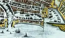 From the end of the 16th century the admiralty also owned the 's-Landswerf shipyard at the northeastern corner of the Nieuwe Haven. It was demolished and rebuilt on the same site in 1660, then extended in 1662 with a second arsenal accessed by a very wide entrance opposite the east gate. In the second half of the 17th century, the Nieuwe Haven was extended to the Buizengat harbour and in consequence the 's-Landswerf was moved to the south bank of the Buizengat in or after 1689. In 1701, a part of the complex at the Groenendaal end was destroyed by fire. The rebuilding of the affected wing was commemorated with a foundation stone laid by Diderik Hogendorp. In the 18th century the second arsenal closed and was modernised by the architect Jan Giudici. G. D. Wijckerheld Bisdom laid its first stone on 8 May 1783.