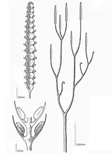 Adoketophyton is a genus of extinct vascular plants of the Early Devonian (Pragian stage, around 410 million years ago). The plant was first described in 1977 based on fossil specimens from the Posongchong Formation, Wenshan district, Yunnan, China. These were originally named Zosterophyllum subverticillatum; later the species was transferred to a new genus as Adoketophyton subverticillatum.[4] One cladistic analysis suggested that it is a lycophyte, related to the zosterophylls.[5] Other researchers regard its placement within the vascular plants as uncertain.[4][6]