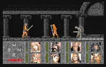 The eight heroes from the Dragonlance series are assembled for the quest, but only one is visible on the screen at a time; when the on-screen hero dies, the next in line appears.[2] The game uses actual Dungeons & Dragons statistics, with statistics for the characters exactly as they were in the rule books.[3] Three characters have special abilities (healing magic, wizard magic, and trap removal), but the other five merely act as "lives" for the player as in traditional action-platforming games.