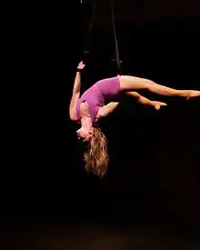 Straps, also known as aerial straps, are a type of aerial apparatus on which various feats of strength and flexibility may be performed, often in the context of a circus performance. It is a cotton or nylon web apparatus that looks like two suspended ribbons. Wrapping the strap ends around hands and wrists, the performer performs holds, twists, rolls and manoeuvres, requiring extreme strength and precision similar to men’s rings in gymnastics. Straps are available in various configurations, including those with various types of loops at the ends and those without loops. A straps act usually includes held poses and postures done on the straps, dance moves performed on the floor away from the straps, partner acrobatics done on and off the straps, as well as having the straps pulled up and let down during the act.[1]