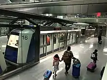 AeroTrain is a 3.78-mile (6.08 km) underground people mover system at Washington Dulles International Airport. It was scheduled to open in fall 2009,[2] but was delayed until 2010 in order to complete reliability tests.[3] It opened to Dulles employees on January 20, 2010, and opened to passengers January 26, 2010.[4] The system mostly[2] replaced the mobile lounges that transport passengers from the concourses to the Main Terminal. The system cost about $1.4 billion and also includes a new security screening mezzanine. The system utilizes 29 Mitsubishi Heavy Industries Crystal Mover vehicles as its rolling stock.
