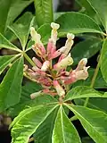 Aesculus species have stout shoots with resinous, often sticky, buds; opposite, palmately divided leaves, often very large—to 65 cm (26 in) across in the Japanese horse chestnut Ae. turbinata. Species are deciduous or evergreen. Flowers are showy, insect- or bird-pollinated, with four or five petals fused into a lobed corolla tube, arranged in a panicle inflorescence. Flowering starts after 80–110 growing degree days. The fruit matures to a capsule 2–5 cm (0.8–2.0 in) diameter, usually globose, containing one to three seeds (often erroneously called a nut) per capsule. Capsules containing more than one seed result in flatness on one side of the seeds. The point of attachment of the seed in the capsule (hilum) shows as a large circular whitish scar. The capsule epidermis has "spines" (botanically: prickles) in some species, while other capsules are warty or smooth. At maturity, the capsule splits into three sections to release the seeds.[3][4][5]