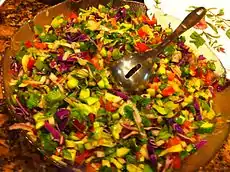 Afghan salad is a salad in Afghan cuisine that is prepared with the primary ingredients of diced tomato, cucumber, onion, carrot, cilantro, mint and lemon juice.[1][2][3] Salt and pepper may be used to season the dish.[1] Additional ingredients may be used, such as bell peppers,[2][4] parsley,[3] radish[4] and herbs,[5] among others.