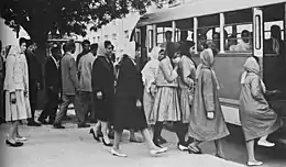 Women were required to wear the all-covering burka, they were banned from public life and denied access to health care and education, windows needed to be covered so that women could not be seen from the outside, and they were not allowed to laugh in a manner that could be heard by others.[41] The Taliban, without any real court or hearing, cut people's hands or arms off when they were accused of stealing.[41] Taliban hit-squads watched the streets, conducting arbitrary brutal public beatings.[41]