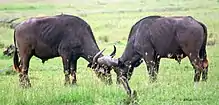 The African buffalo or Cape buffalo (Syncerus caffer) is a large sub-Saharan African bovine.[2] Syncerus caffer caffer, the Cape buffalo, is the typical subspecies, and the largest one, found in Southern and East Africa. S. c. nanus (the forest buffalo) is the smallest subspecies, common in forest areas of Central and West Africa, while S. c. brachyceros is in West Africa and S. c. aequinoctialis is in the savannas of East Africa. The adult African buffalo's horns are its characteristic feature: they have fused bases, forming a continuous bone shield across the top of the head referred to as a "boss". It is widely regarded as one of the most dangerous animals on the African continent, and according to some estimates it gores, tramples, and kills over 200 people every year.