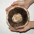 When marketed in its mature state, the mushroom is brown with a cap measuring 10–15 centimetres (4–6 inches).[5] This form is commonly sold under the names portobello mushroom,[5][6] portabella mushroom,[7] and portobella mushroom, but the etymology is disputed.[5][6]